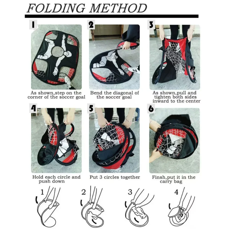 【Perfect Size】Expand size: 120x80x80cm/ 47.2x31.5x31.5inch. Saving more space to carry by our diameter 40cm/16 inch round storage bag. 4 fastening nails, fix the soccer goal to the ground to withstand the strong kicks, and prevent the wind.